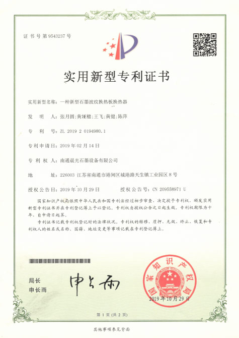 實(shí)用新型專利 :一種新型石墨波紋換熱板換熱器 專利號(hào):ZL 2019 2 0194980.1