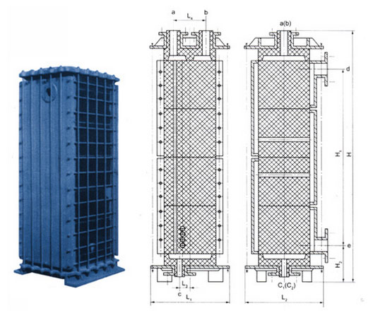 矩形塊孔式石墨熱交換器由截面為矩形的單元換熱塊疊裝而成,整體強(qiáng)度高,耐熱沖擊性能好,傳熱效率高使用壽命長。本公司常規(guī)生產(chǎn)均為內(nèi)聯(lián)式單向耐腐蝕3JK型與KS型兩系列。